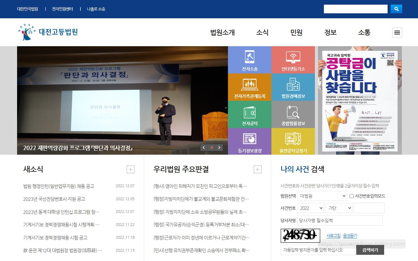 아래는 대전고등법원 홈페이지 첫화면이다. 여기에는 법원소개.소식.민원.정보.소통의 카테고리로 메뉴가 분류되어있다.