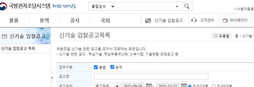 방위사업청 홈페이지에는 전자조달시스템에 접속할 수 있는 방법이 있는데 바로 물품 용역 등에 대해 볼수 있는 페이지입니다. 공고명을 입력 또는 공고일자를 설정하여 입찰공고를 확인할 수 있습니다.