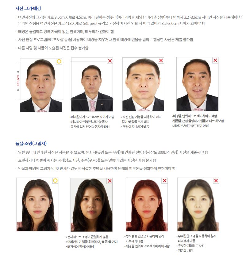 국제민간항공기구에서 정한 기준에 따라 여권은 촬영된지 6개월 이내 사진으로 본인임이 확인될 수 있는 변형이 되지 않은 사진만 가능합니다. 상황에 따라 규격에 맞지 않으면 여권접수 지연, 반려 또는 불가의 상황이 발생할수도 있습니다.