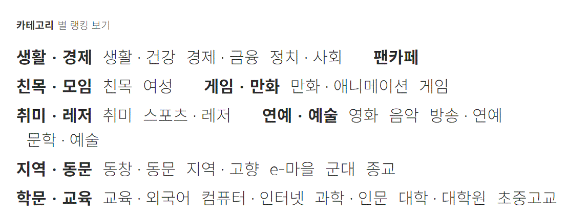 다음 카페에서 스크롤을 좀 내리면 카테고리별 카페를 볼 수 있는 창이 나옵니다. 관심 분야에 들어가면 관련 카페 목록을 볼 수 있고 그중 내가 활동하고 싶은 곳에서 가입하고 활동하면 됩니다.