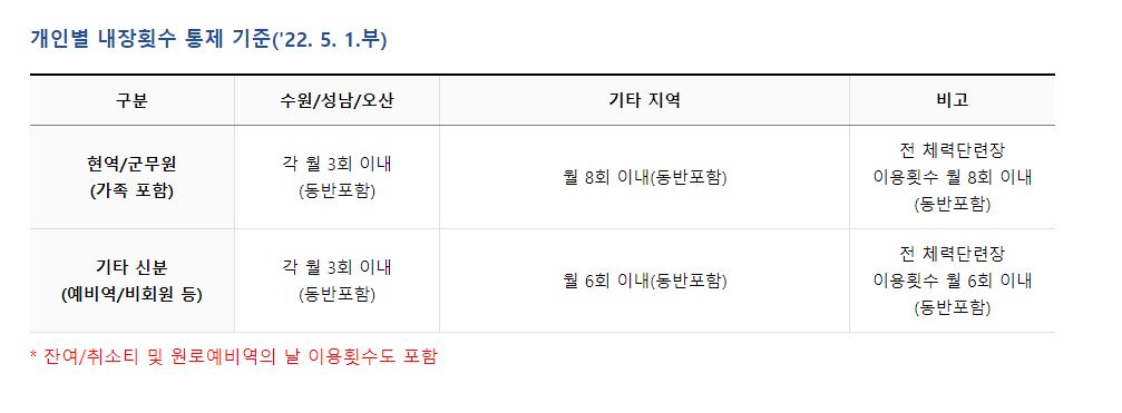 - 예비역 및 비회원 등은 수원 성남 오산은 현역 및 군무원과 동일하며 기타지역은 월 6회 이내입니다.