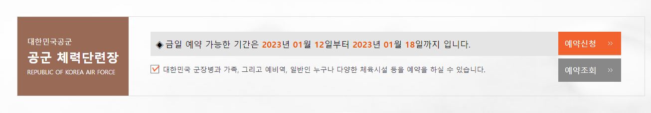 예약 순서 >>> 공군복지시설예약체계에서 로그인후 - 예약/조회 페이지에서 "신청버튼" - 체력단련장 선택 - 시간 선택 - 동반자 (2명 이상) 입력 - 확인 순으로 진행하면 됩니다.