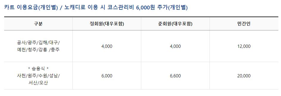 카트 이용요금은 아래와 같습니다. 노캐디로 이용할 경우 코스 관리비가 개인별로 추가 됩니다. 공사 광주 김해 대구 예천 청주 강릉 충주와 승용식 사천 원주 수원 성남 서산 오산은 가격이 다릅니다. 아래 표를 참고하시어 정확한 금액을 확인하시기 바랍니다.
