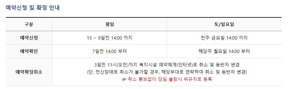 - (예약신청) 예약신청은 이용일 기준 15일부터 9일전까지 오후 2시내에 예약을 받고 있습니다. 전날 또는 일주일 전 예약 후 이용은 불가합니다. 반드시 예약일 내에 예약을 해야합니다. 예약시간을 반드시 확인해주십시오. 간혹 이용일 바로 직전에 예약을 하려고 하다가 안되는 경우를 많이 봤습니다.