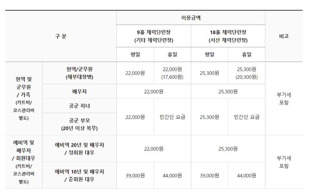 이용요금은 아래와 같으며 정회원이나 준회원이 민간인의 날에 이용할 경우 민간인 요금이 적용됩니다. 단, 잔여팀 발생에 따른 배정팀의 경우 해당 신분의 요금이 적용됩니다.