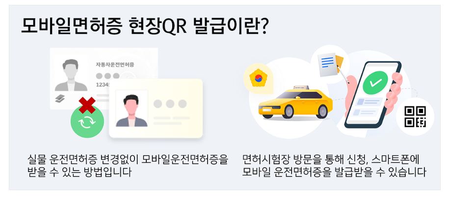 현장 QR발급은 실물 운전면허증 변경을 하지 않고 모바일운전면허증을 받는 방법으로, 면허시험장 방문을 하여 스마트폰에 모바일 운전면허증을 발급받을수 있습니다.
