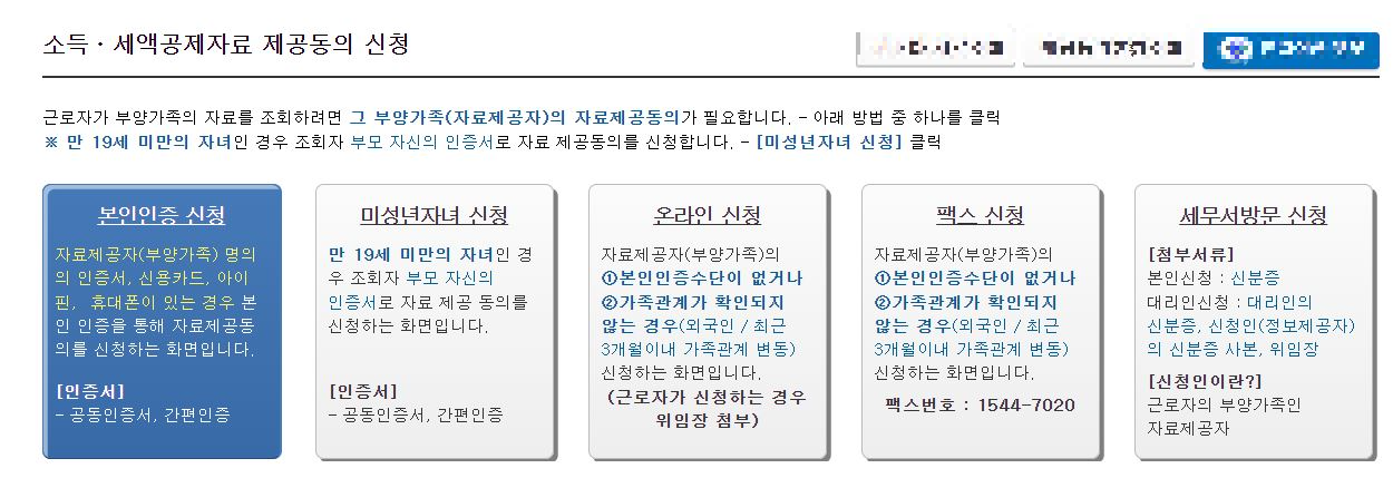 연말정산간소화 서비스를 통해 간단하게 연말정산을 진행하더라도 '부양가족에 대한 자료 조회'를 해야하는 경우는 국세청홈페이지에서 해야합니다. 하단에 국세청 바로가기를 이용하시면 됩니다. 다섯가지 방법이 있습니다. 1) 본인인증 2) 미성년자녀 3) 온라인 4) 팩스 5) 세무서 방문중에서 여러분이 편한 방법으로 할 수 있습니다.
