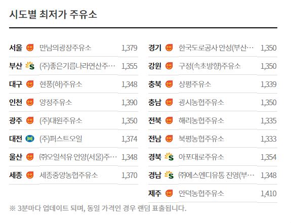 3분마다 시도별 최저가 주유소도 알려주네요.