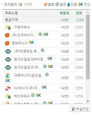 서울시 금천구를 검색해보았더니 총 13개가 나오고 주유소 리스트가 나옵니다. 아래 엑셀저장을 누르면 가격 리스트 다운도 되네요.