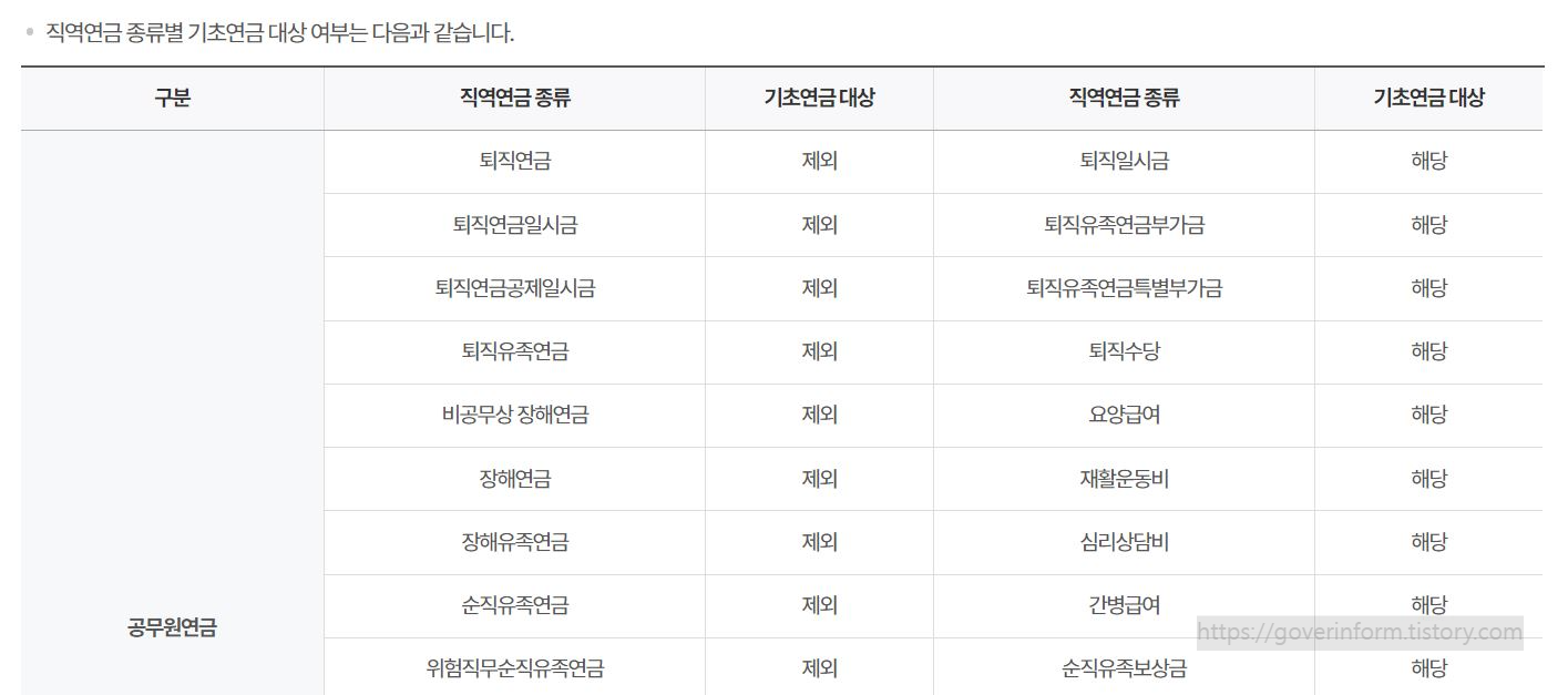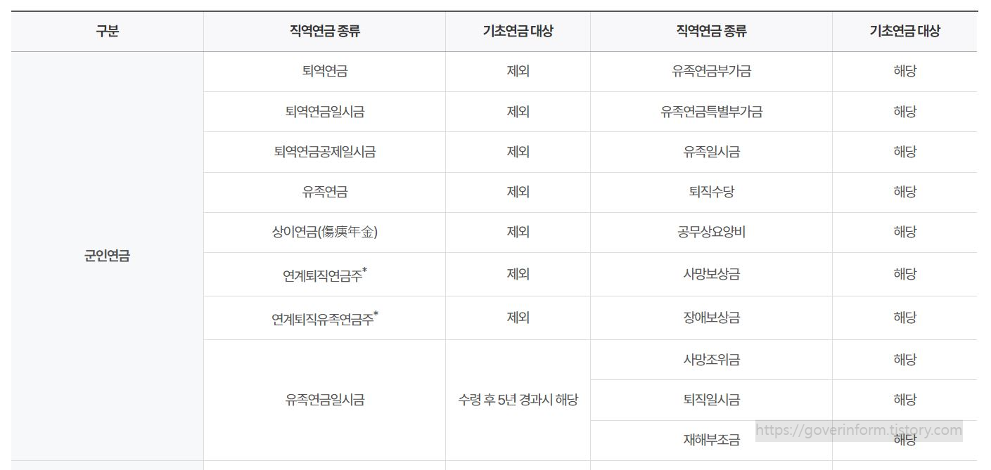 직역연금 종류별 기초연금 대상 여부는 다음과 같습니다.