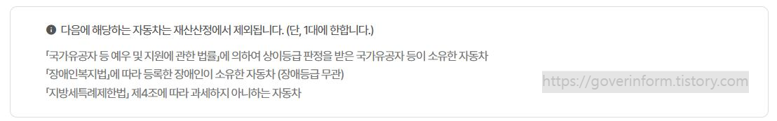 - 3,000cc 이상 혹은 차량가액 4,000만원 이상의 승용차, 승합차 또는 이륜차를 보유하신 경우 기본재산공제 대상에서 제외되고, 월 100%의 소득환산율이 적용됩니다.