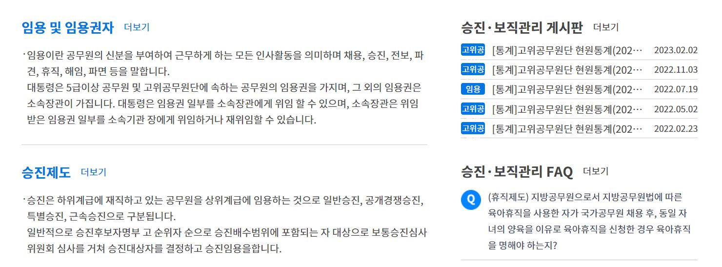 인사혁신처에는 공무원인사제도에 대한 안내가 있으며 승진및보직관리, 채용제도, 성과보수제도, 연금복지제도, 재해보상제도, 인재개발제도, 복무제도, 윤리제도 등이 있습니다.