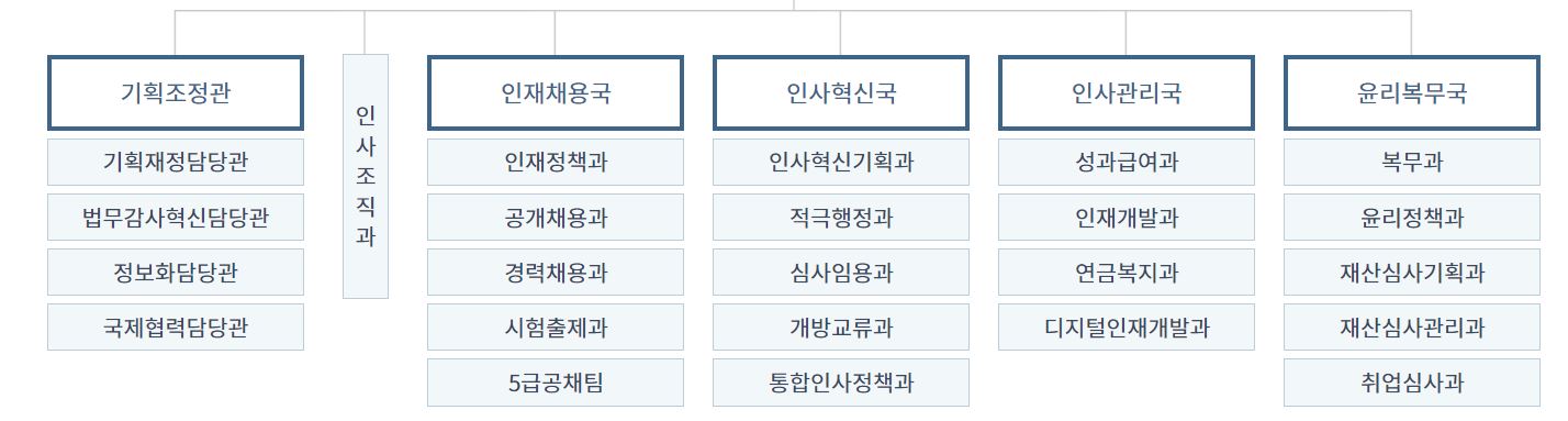 인사혁신처 조직도는 다음과 같습니다. 기획조정관, 인재채용국, 인사혁신국, 인사관리국, 윤리복무국이 있으며 공무원 협력 담당관과 재해 보상 정책관도 있습니다. 담당부서를 모르는 경우는 정부민원안내콜센터로 연락하면 상담원이 알려줍니다.
