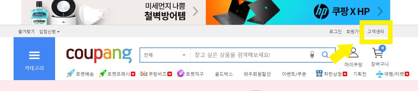 구글 검색창에 쿠팡을 입력하면 쿠팡 홈페이지 주소가 나오고 여기에 접근하면 쿠팡 홈페이지 첫 화면을 볼 수 있다. 쿠팡 홈페이지 첫화면 우측 상단에 고객센터가 있고 여기에 접근한다.