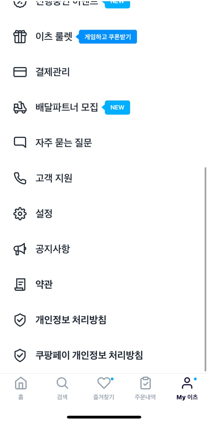 쿠팡이츠 앱에서 자주묻는질문을 이용할 수 있다. 쿠팡이츠 앱에 접근하면 다음과 같은 화면이 보이고 하단에 보면 My 이츠라고 되어있는 아이콘에 접근하면 '자주 묻는 질문' 메뉴가 있다.