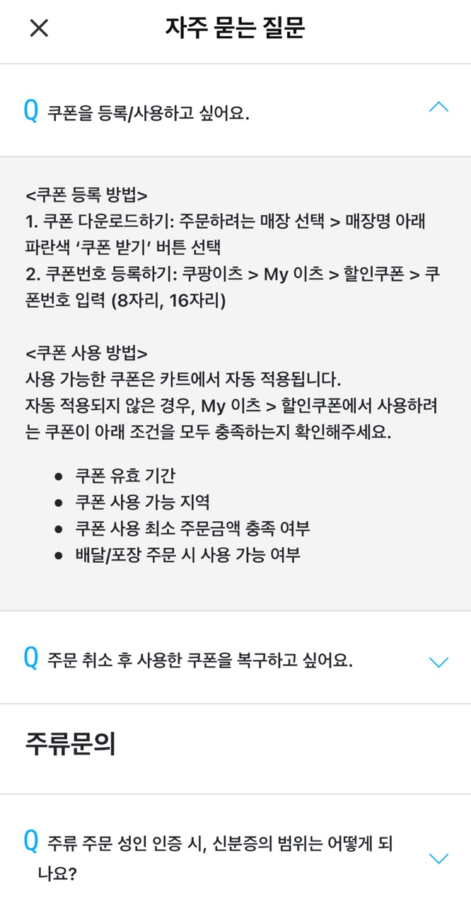 자주묻는질문을 터치하면 주문 접수, 주문확인, 결제, 최소/환불, 배달비 문의, 배달일정, 배달지연 등에 대한 자주묻는질문과 이에 대한 답글이 나와있다.