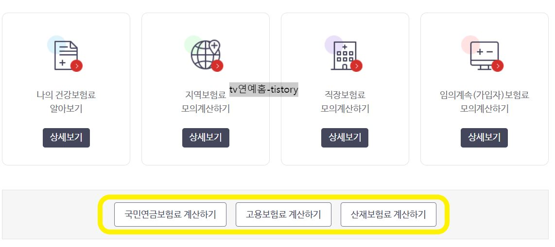 6. 하단에 국민연금보혐료, 고용보혐료, 산재보혐료 계산 서비스 선택 항목도 있습니다. 원하는 서비스 항목을 선택합니다.