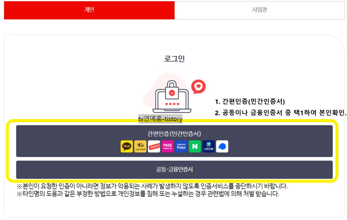 7. 본인 확인은 필수입니다. 간편인증, 공동 또는 금융인증서중 편한 방법으로 선택하여 본인확인절차를 거칩니다.