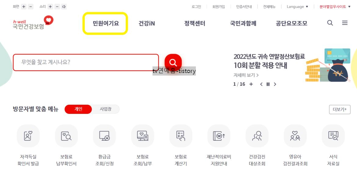 2. 국민건강보험 홈페이지는 아래와 같습니다. 국민건강보험 홈페이지 상단 민원여기요에 접근합니다.