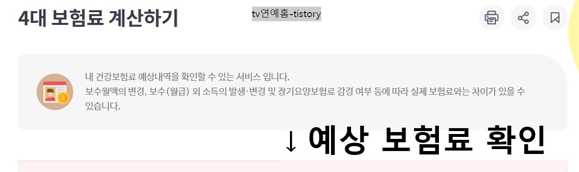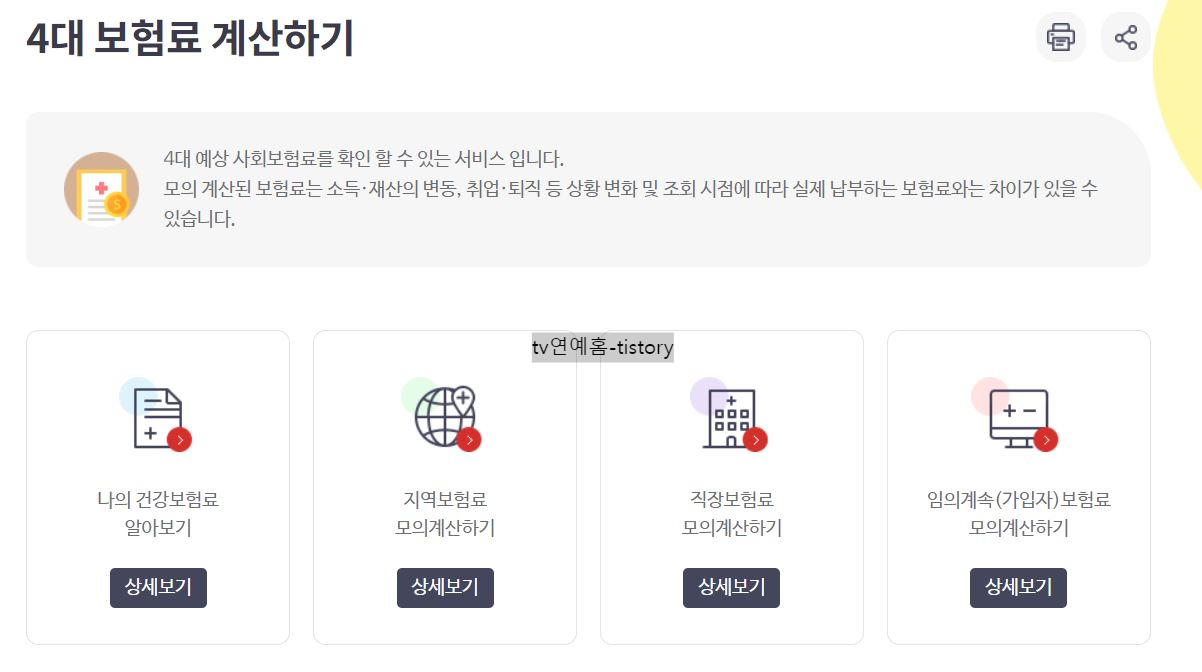국민건강보험공단에서는 4대 예상 사회보험료를 확인할 수 있는 서비스를 제공합니다. 모의 계산 서비스이며 계산된 보험료는 소득이나 재산, 취업 퇴직 등 상황 변화 및 조회 시점에 따라 실제 납부 보험료와는 다소 차이가 있을 수 있습니다.