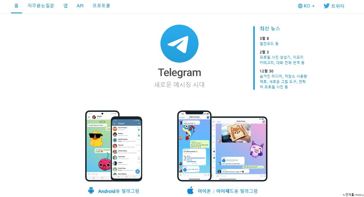 텔레그램 메신저에 접근 시 보게 되는 텔레그램 홈페이지 첫 화면입니다.