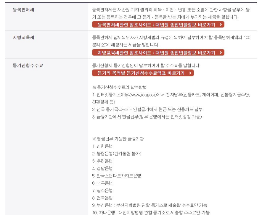 부동산 등기 시 소요되는 비용에는 국민주택채권매입비용, 등록면허세, 지방교육세, 인지세, 등기신청 수수료가 있어요. 부동산 등기비용 또는 모든 등기 비용 조회는 인터넷등기소 홈페이지> 등기비용안내에서 확인할 수 있어요!!!