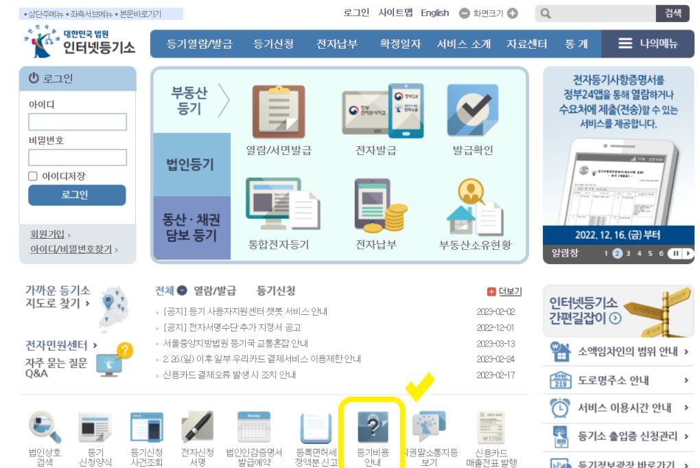 이 밖에는 법인상호 검색, 등기 신청양식, 등기신청사건조회, 전자신청서명, 법인인감증명서 발급예약, 등록면허세 신고, 등기비용안내, 직권말소통지등보기, 신용카드 매출전표 발행 서비스가 있습니다. 등기비용은 부동산, 법인, 동산 및 채권담보의 비용을 안내하고 있습니다~~~