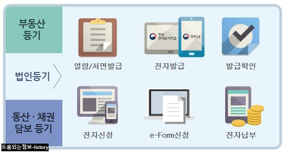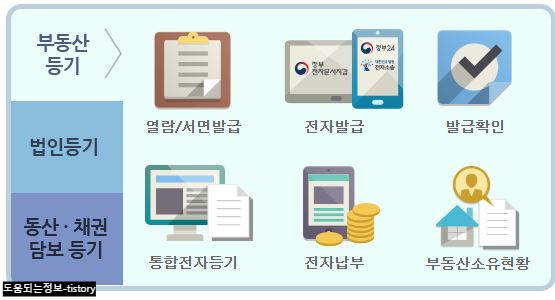 이용가능한 서비스에는 등기열람 및 발급, 등기신청, 전자납부, 확정일자, 서비스 소개, 자료센터, 통계가 있습니다. 등기열람 및 발급 서비스 이용이 가능한 등기 종류는 부동산, 법인, 동산 및 채권담보 등기가 있습니다. 열람, 발급, 발급확인, 전자신청, 이폼신청, 전자납부 서비스 등을 이용을 할 수 있어요!!!