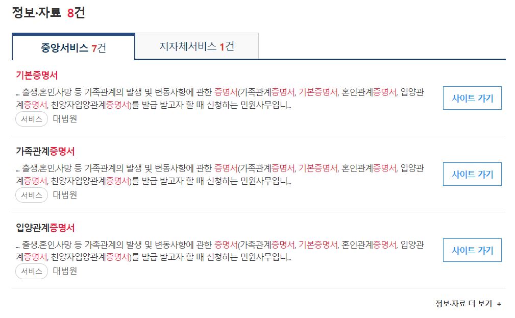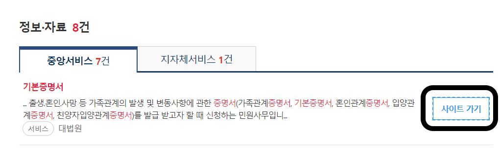 3. 기본증명서 통합검색창에서 하단으로 화면을 내리다 보면 정보·자료 창에 기본증명서가 있습니다. 기본증명서 우측 사이트 가기를 터치하면 대한민국 법원 전자가족관계등록시스템 화면으로 이동합니다.