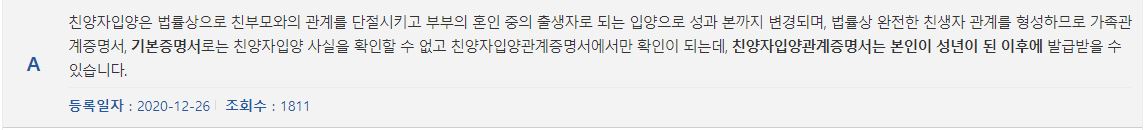 A 친양자입양은 법률상으로 친부모와의 관계를 단절하고 부부의 혼인 중의 출생자로 입양되기에 성, 본이 변경되고 법률상 완전한 친생자 관계를 형성하므로 가족관계 증명서나 기본증명서에서는 친양자입양 사실을 확인할 수 없으며 친양자입양관계증명서에서만 확인이 가능하며 이는 본인이 성년 이후에 발급 가능합니다.