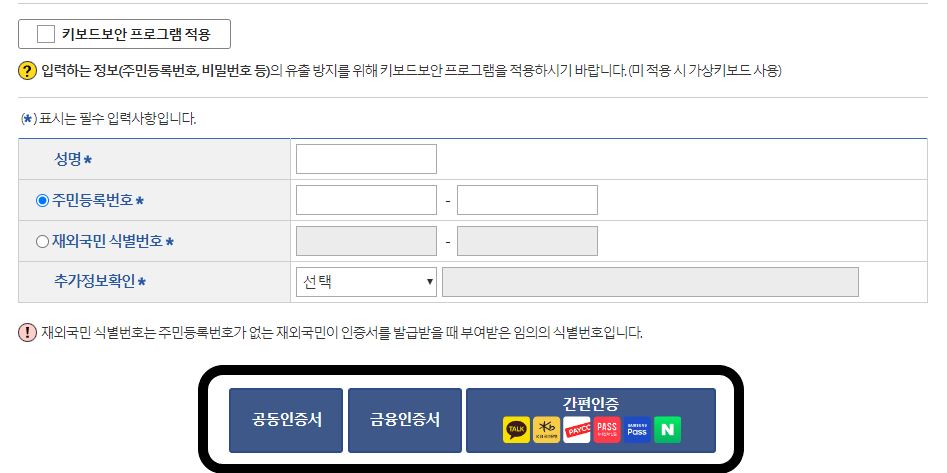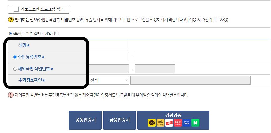 6. 기본증명서 발급을 위한 절차중 하나인 성명, 주민등록번호, 추가정보확인 창에 내용을 입력하고 공동인증서, 금융인증서나 간편 인증 중 한 가지를 선택하여 본인확인을 합니다.