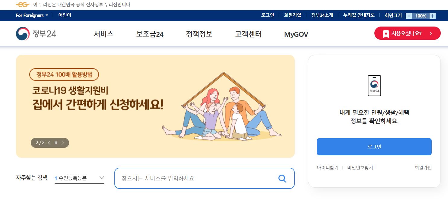 정부 24는 대한민국 서비스, 정책정보, 기관정보를 안내받고 기관별 주요 서비스를 정부 24 홈페이지에서 신청 발급할 수 있습니다. PC, 모바일, 태블릿 등 다양한 디바이스에서 편리하게 이용이 가능합니다.