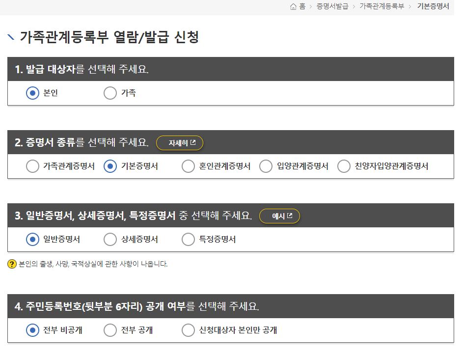 8. 기본증명서 발급을 위한 1. 발급 대상자 2. 증명서 종류 3. 일반증명서, 상세증명서, 특정증명서를 선택하고 주민등록번호 뒷자리 공개 여부를 선택하고 화면을 아래로 내려 수령방법 등을 선택합니다.