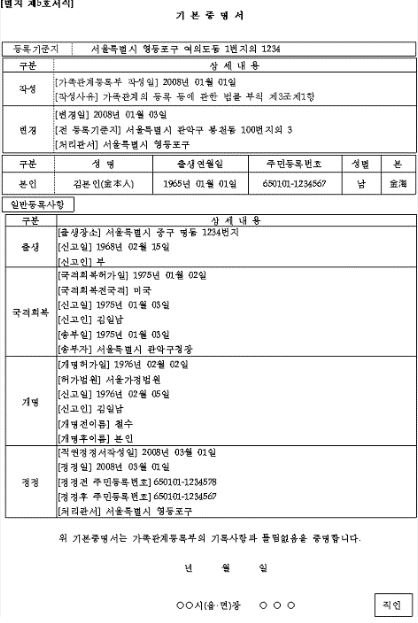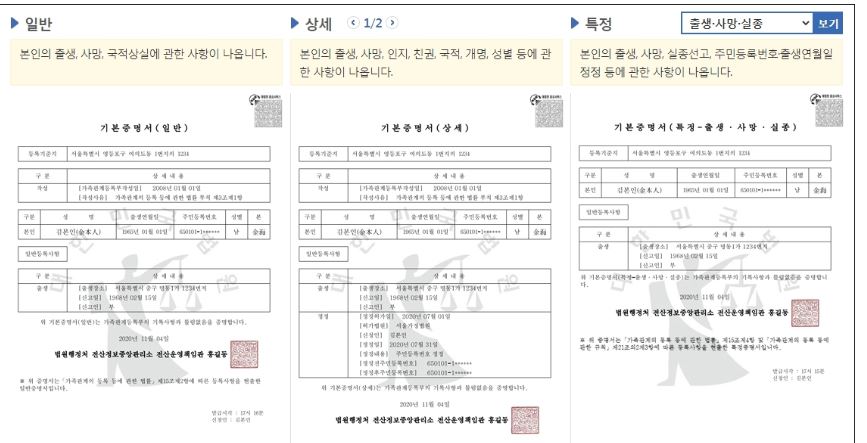 기본증명서란? 기본증명서는 개인의 출생 등에 대한 사실을 증명하는 서류이며 1) 출생 2) 국적변경 3) 개명 4) 친권 등의 내용이 표시됩니다. 기본증명서 일반의 경우, 현재 유효한 사항만 표시되며 기본증명서 상세는 개명 전 이름과 같이 과거 사항도 함께 표시가 됩니다. 제출할 곳이나 요구하는 곳에 따라 일반과 상세 중 선택하여 발급받으면 됩니다.
