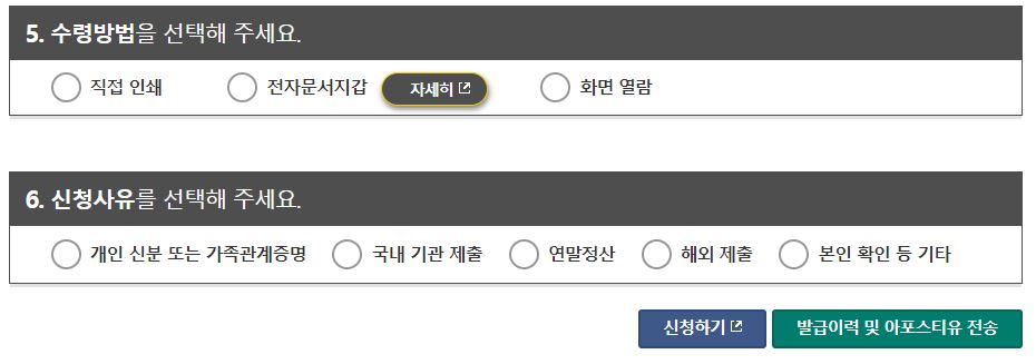9. 수령방법은 직접인쇄, 전자문서지갑, 화면 열람이 있으며 증명서를 프린터로 직접 인쇄를 원하는 경우 직접 인쇄, 전자문서지갑 앱에서 열람하기를 원하는 경우는 전자문서지갑, 화면에서 열람을 하는 경우 화면 열람을 선택하면 됩니다. 선택이후 신청하기를 터치합니다.