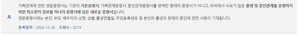 A 가족관계에 대한 영문증명서는 기존의 기본증명서, 가족관계증명서, 혼인관계증명서를 번역한 형태의 증명서가 아니고 외국에서 수요가 많은 출생 및 혼인관계를 증명하기 위한 최소한의 정보를 하나의 증명서에 담은 새로운 증명서입니다.