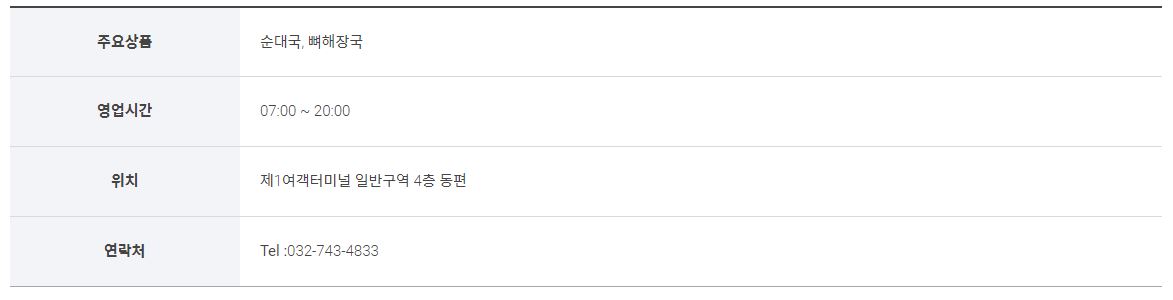 인천국제공항 푸드코트 이름은 플레이보6 입니다. 신의주찹쌀순대는 제1여객터미널 일반구역 4층 동편에 위치한 푸드코드에 있으며 순댓국과 뼈해장국 순대만, 김치순댓국, 신의주정식, 한우소머리국밥, 뼈해장국 등이 인기가 있어요~ 운영시간은 오전 7시부터 저녁 8시입니다~