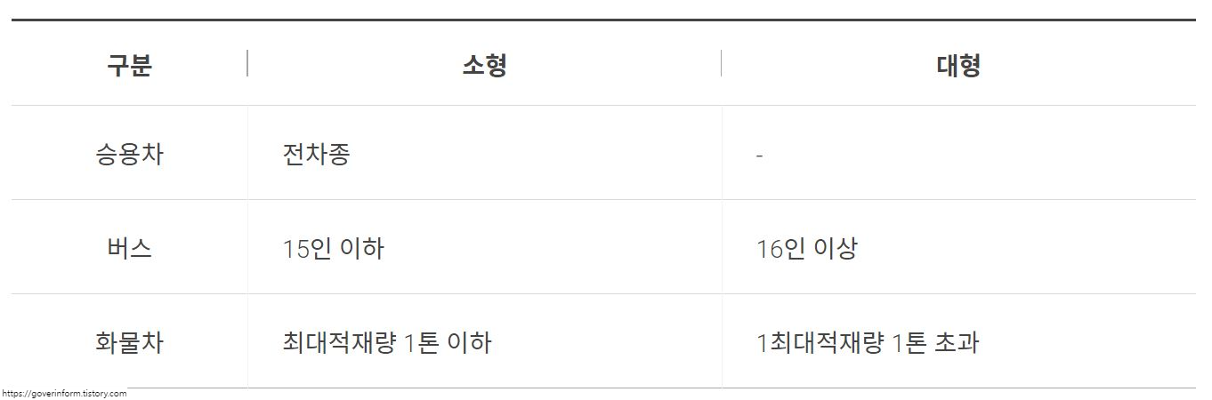 주차 요금에 기재되어 있는 차량 구분 기준은 승용차, 버스, 화물차로 구분되고 승용차(전차종), 버스(소형-15인 이하/대형-16인이상), 화물차(최대적재량 1톤 이하-소형/1 최대적재량 1톤 초과-대형)로 세부적으로 구분됩니다.