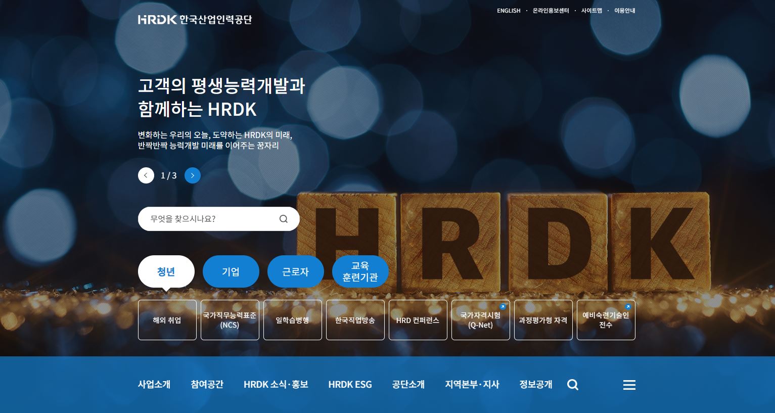 hrdk한국산업인력공단은 근로자와 기업의 인적자원개발을 지원하는 사업인 평생능력개발, 국가직무능력표준, 국가자격시험, 외국인고용지원, 해외취업과 숙련기술장려 등을 수행하고 있습니다.