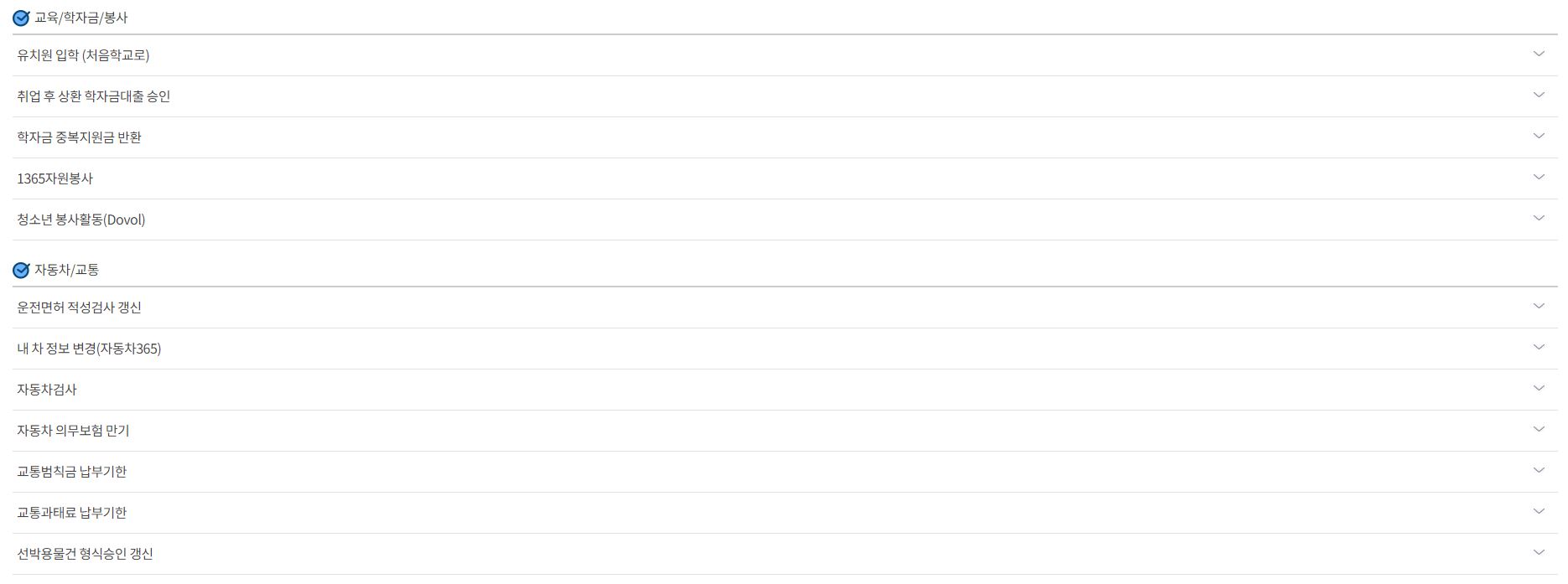 국민비서 구삐 알림서비스 안내: 건강검진, 전기요금, 주택임대차, 국세고지서, 휴면예금, 국민연금 청구안내, 4대 보험 가입, 개인지방소득세 신고 및 납부 안내, 주민등록증 발급 통지, 분실 주민등록증 습득, 전자상거래 물품통관내역, 정부 24(민원신청, 보조금 24), 자동차등록 제세공과금, 문서 24 도우미, 해운항만 민원, 본인정보 조회내역(행정정보 공동이용), 본인정보 열람 내역(공공 마이데이터), 유치원 입학(처음학교로), 취업 후 상환 학자금대출 승인, 학자금 중복지원금 반환, 1365 자원봉사, 청소년 봉사활동, 운전면서 적성검사 갱신, 내 차 정보 변경(자동차 365), 자동차검사, 자동차의무보험 만기, 교통범칙금 납부 기한, 교통과태료 납부기한, 선박용 물건 형식승인 갱신, 국가공무원 공개경쟁채용시험, 항공종사자 자격시험, 어린이 통학버스 운전자 교육, 고령운전자 교육, 민간자격 보수교육, 제주 운수종사자 보수교육, 교통안전담당자 보수교육, 범죄경력회보서 발급, 세움터 민원, 코로나19 접종예약