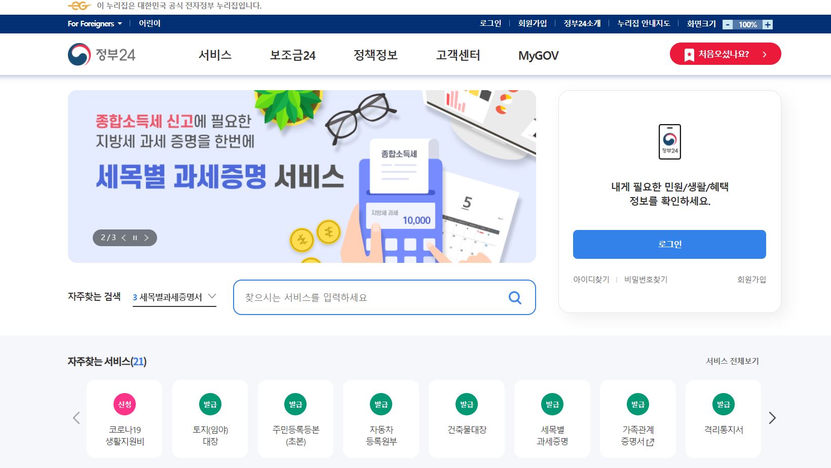정부 24는 대한민국 서비스, 정책정보, 기관정보를 안내받고 기관별 주요 서비스를 정부 24 홈페이지에서 신청 발급할 수 있습니다. PC, 모바일, 태블릿 등 다양한 디바이스에서 편리하게 이용이