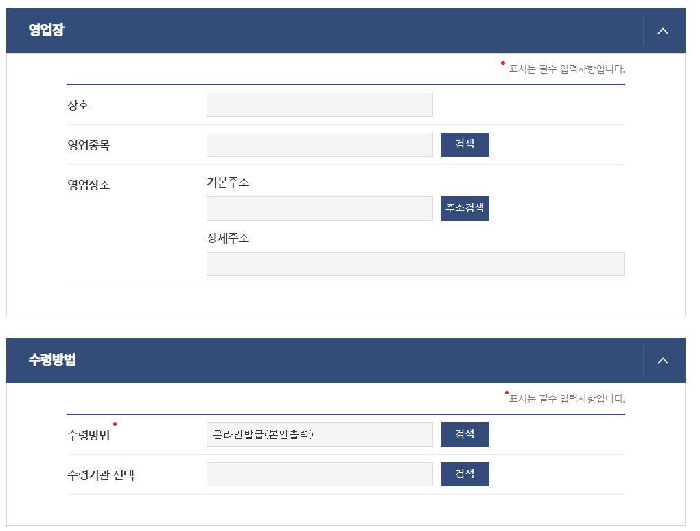 3. 영업장(상호, 영업종목, 영업장소) 및 수령장소 작성 또는 선택