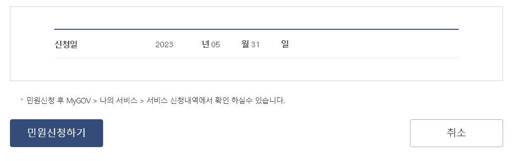 4. 신청일 확인후 민원신청하기 버튼 터치(본 페이지 하단에 정부 24 바로가기가 있습니다. 많은 이용 바랍니다.)