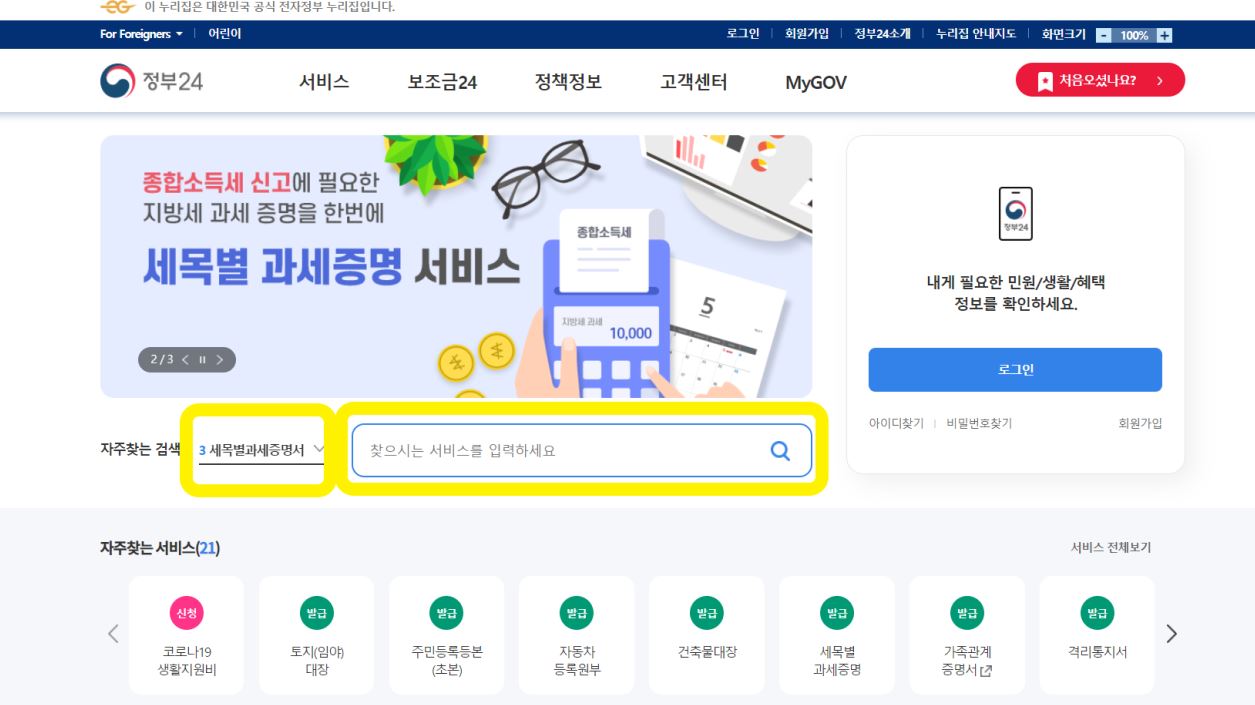 2) 정부 24 홈페이지 첫 화면은 아래와 같으며 첫 화면에 보이는 자주 찾는 검색 또는 검색창에 '세목별 과세증명서' 입력 후 검색 또는 세목별 과세증명서비스를 터치하면 서비스 이용이 가능합니다.