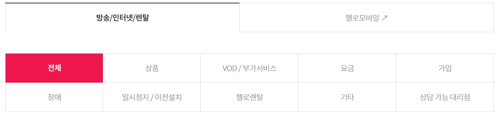 자주 찾는 질문은 상품, vod/부가서비스, 요금, 일시정지/이전설치, 기타, 상담 가능 대리점 등의 카테고리 내에서 검색이 가능하며 기존 문의내역에 대한 답변을 바로 확인할 수 있습니다.