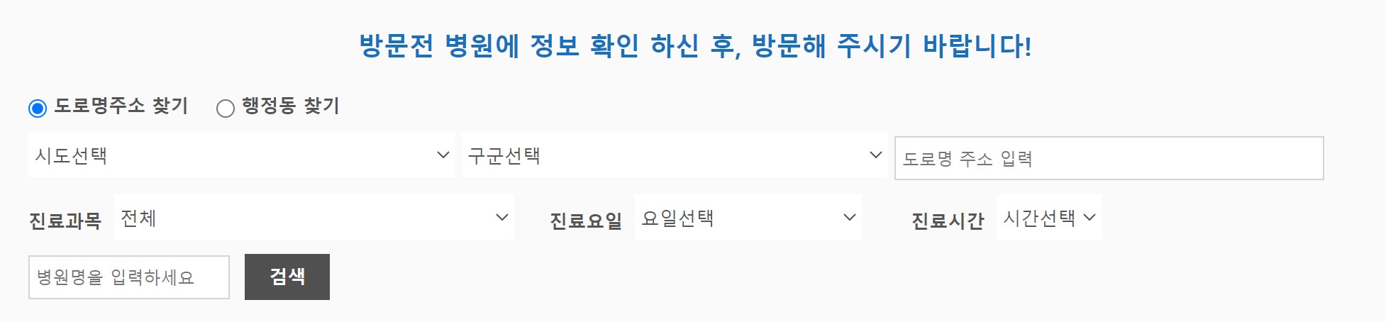 - 검색 시 병원, 진료시간, 주소, 전화번호, 현재 진료 가능 여부, 입원실 유무, 위치를 알 수 있습니다.
