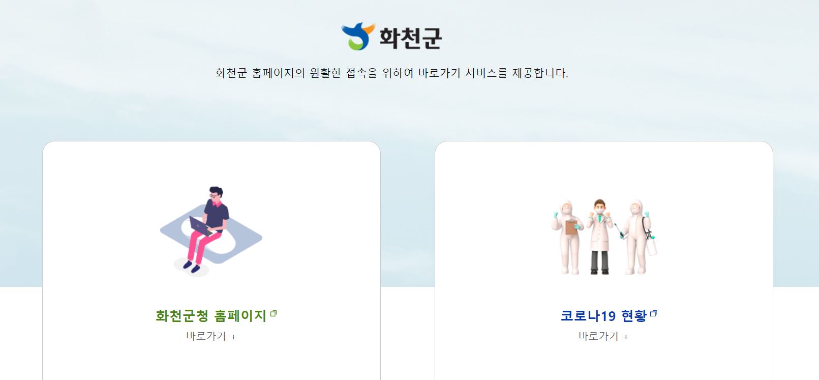 화천군청 홈페이지에는 코로나19정보도 있으니 홈페이지 방문하시어 도움되는 정보를 찾아보시길 바랍니다.