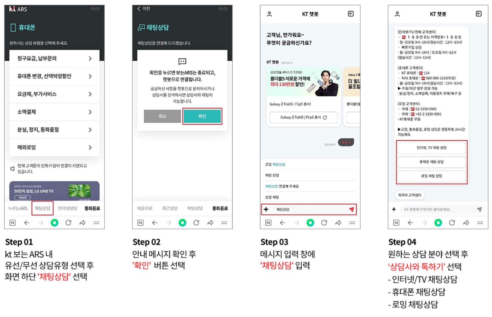 3) KT '보는 ARS'에서 채팅상담을 누르고 연결된 'KT챗봇'에서 상담사와 톡 하기를 선택