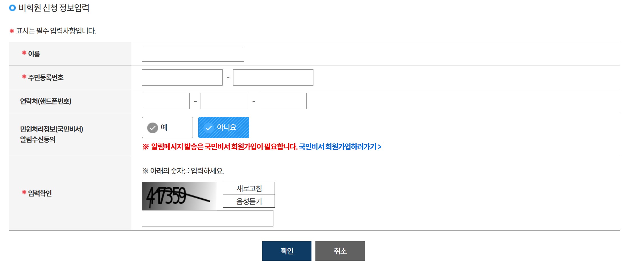 비회원으로 신청하더라도 일부 서비스는 간편 인증 또는 인증서(공동, 금융)가 별도로 필요합니다.