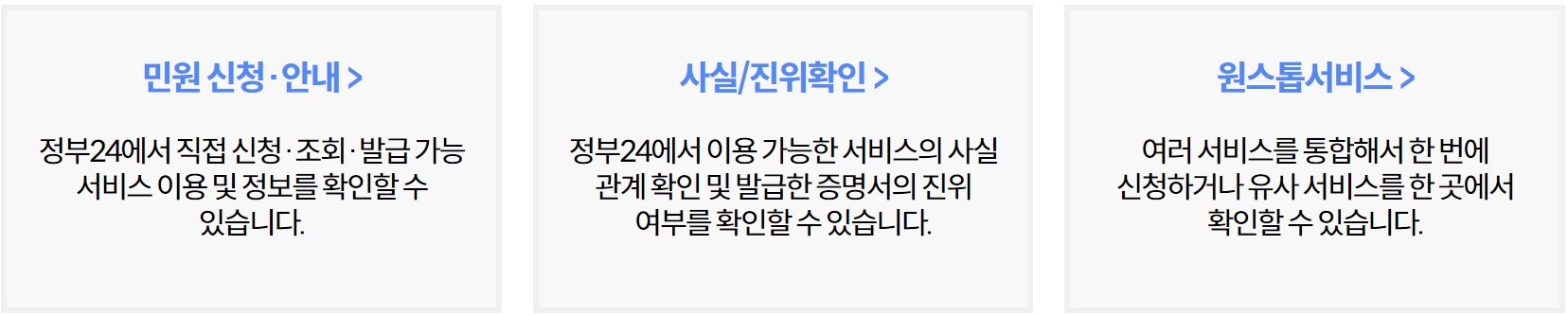 정부 24의 주요 서비스를 안내드립니다. 주로 3가지가 있는데요^^